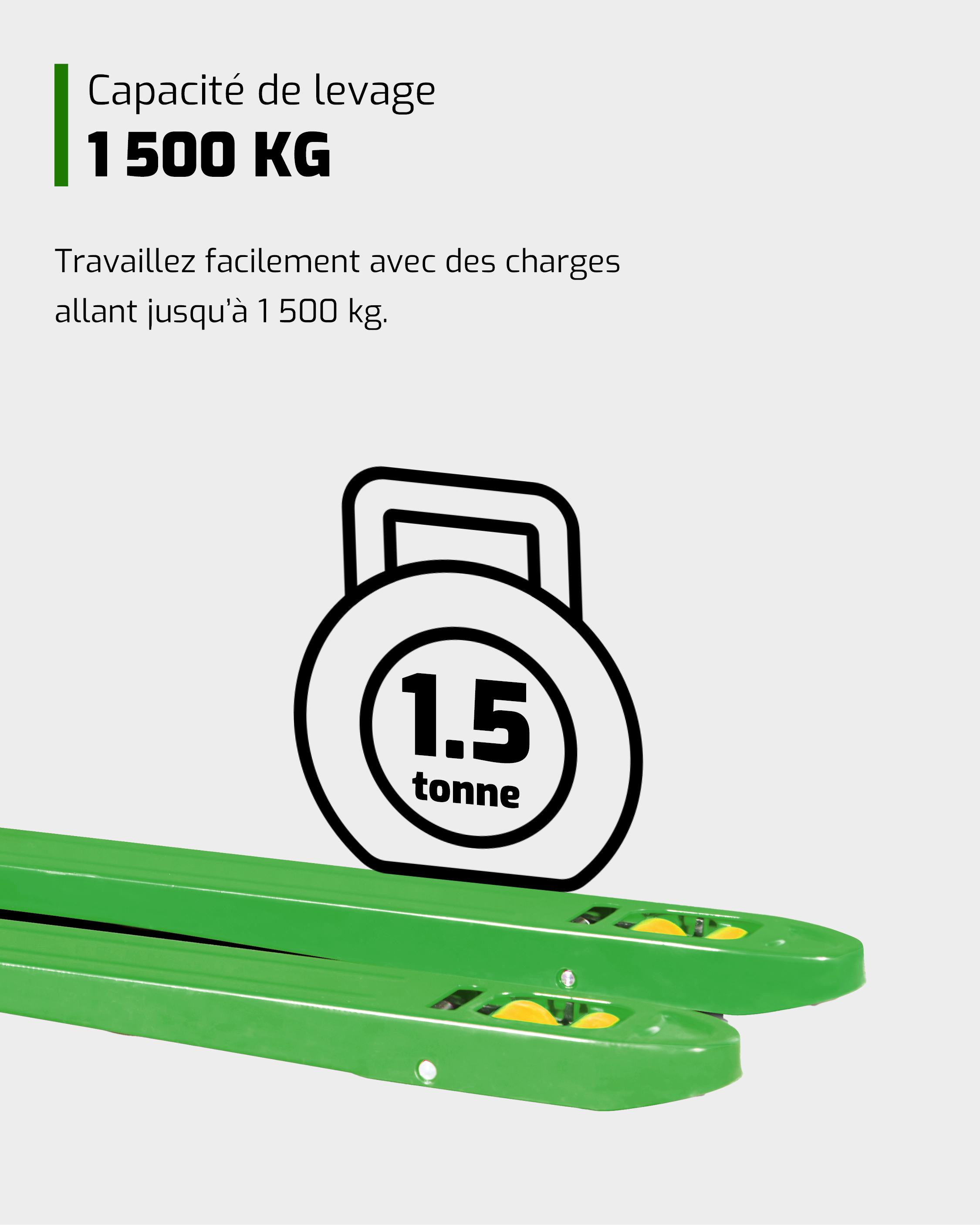 Avec sa capacité de levage de 1 500kg, il répondra parfaitement à vos besoins de manutention dans les entrepôts, les magasins, les zones de préparation de commandes ou même les camions de transport.