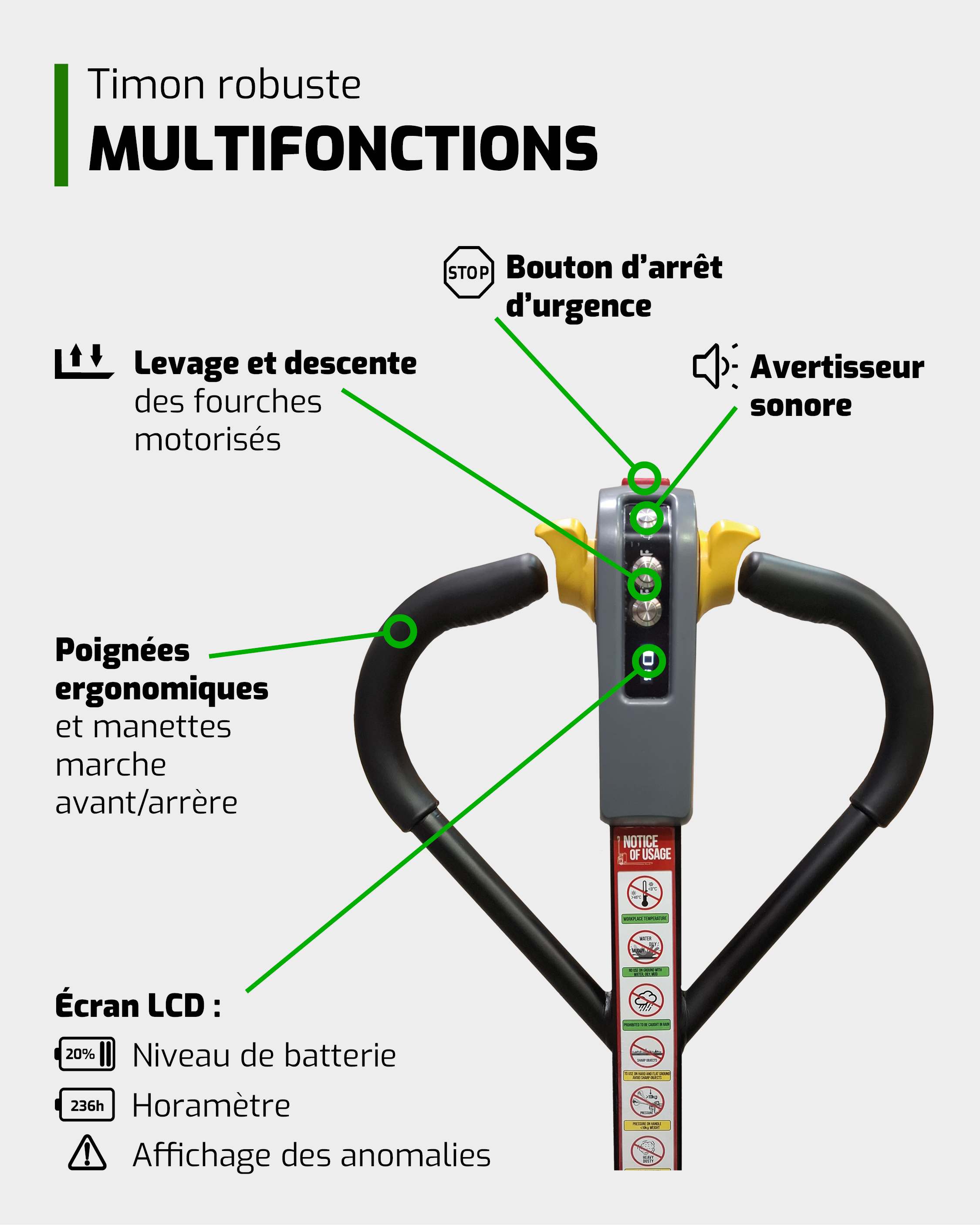 Ce transpalette est donc idéal pour les utilisations intensives sur plusieurs cycles par jour ce qui en fait une machine parfaite pour les opérations de manutention au quotidien.